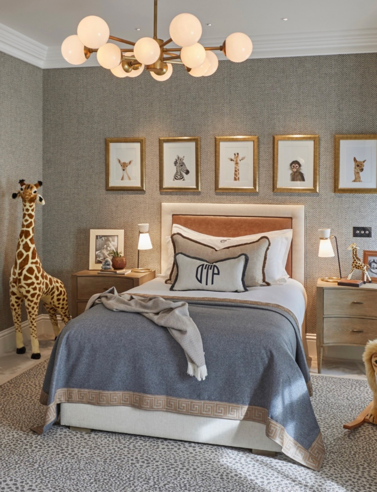 The children’s rooms bring a softer note, with dusty pink tones and a gentler decorative touch.