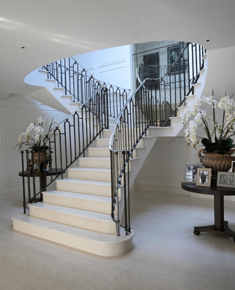 Built as a blank canvas, the house has a sense of order and ease that runs through every room. Downstairs, the family kitchen feels elegant yet relaxed, while the formal sitting room is more dressed with a richer and more decorative mood. A sweeping staircase adds a beautiful sense of grandeur and the entrance hall is kept deliberately light, with an oversized églomisé mirror heightening the feeling of space and brightness.
