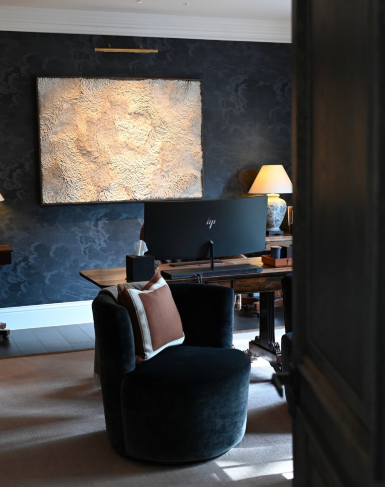 The principal bedroom is feminine and cocooning with deep burgundy chinoiserie walls, while the study takes on a darker, more masculine character with midnight blue and mahogany antiques.