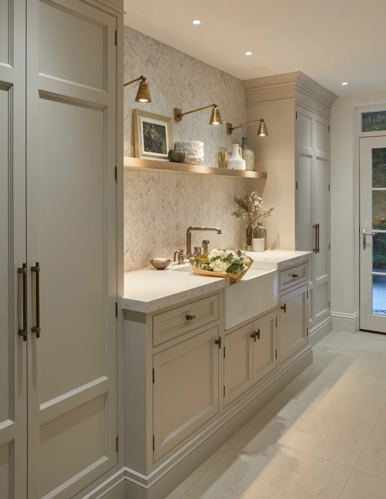 Even the utility room feels unusually considered, planned with painted cabinetry, brass hardware and the kind of practical detail that makes family life look sophisticated.
