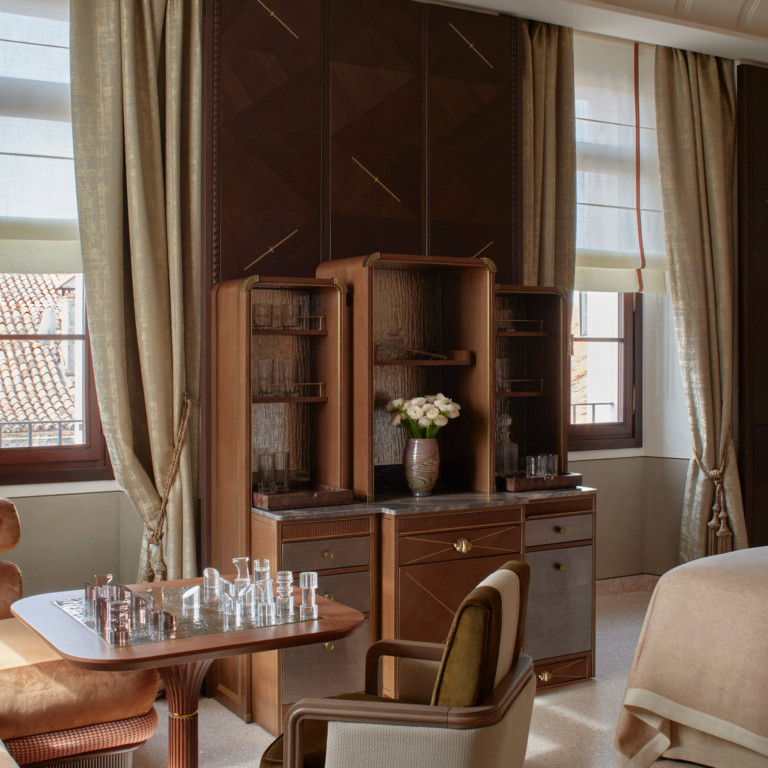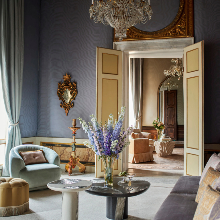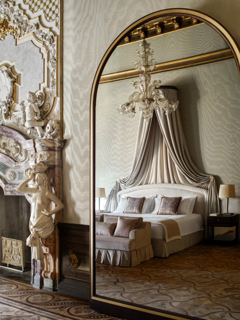 The hotel offers 47 rooms, suites, and residences, with interiors shaped by frescoes, mosaic floors, ornate ceilings and canal views. One of the most striking spaces is the lobby, once an open cortile and now reimagined as a grand living room with sculpted boiserie and bespoke Murano chandeliers. Arrival is by boat through a Gothic water gate, which feels exactly right for a brand built on ceremony and old-world glamour.