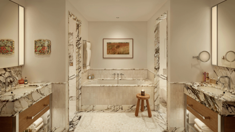 Inside, the interiors celebrate craftsmanship and timeless materials. Statement marble, brushed brass detailing and oak paneling create an opulent yet calm atmosphere. Each residence offers open, light-filled spaces with panoramic river views, while the lobby and lounges evoke the feel of a contemporary art gallery; curated, refined and connected to the urban fabric beyond.